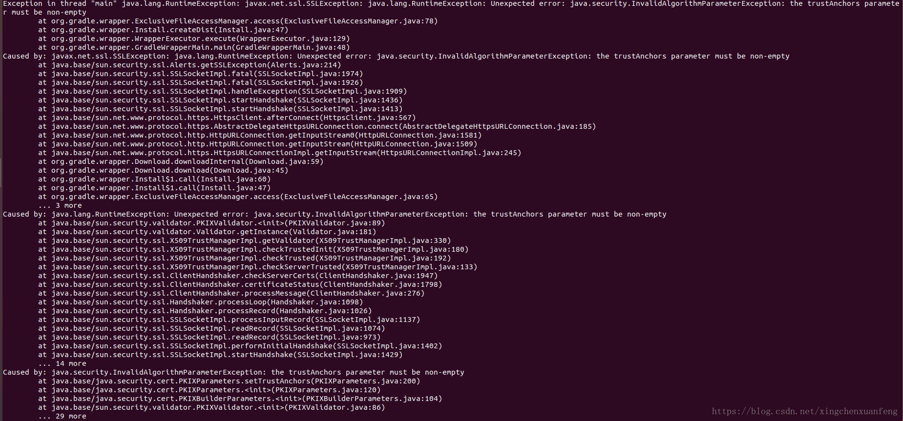 javax.net.ssl.SSLException 解决办法(踩坑) 发表于 2018-06-07 分类于 其他 刚刚安装了ubuntu18.04 ,运行/gradlew assembleDebug的时候报异常javax.net.ssl.SSLException 在网上找找别人的踩坑指南,找了很久很久,终于在stackoverflow上的一行小字找到了解决方法。点击打开链接 很简单,执行如下两句命令,重新生成获取证书即可。 sudo rm /etc/ssl/certs/java/cacerts sudo update-ca-certificates -f