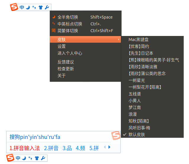 更改设置,点击输入操作条上的扳手按钮,可以设置皮肤,设置熟悉的习惯,还可以登录个人中心,同步个人词库。